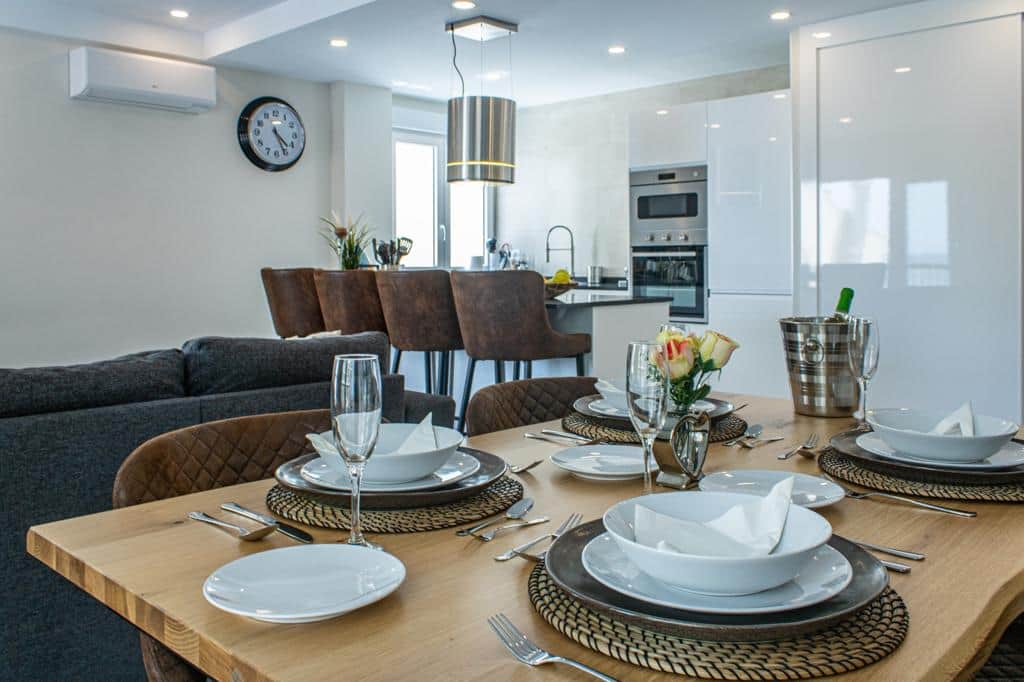 This luxury apartment Mediterraneano is a very comfortable apartment of 100m2 which has recently been completely renovated, for a maximum of 4 people on the second floor of the complex. There are 2 elevators in the building. The spacious living room has an open kitchen with a cooking island, a dining area and a separate sitting area. The open kitchen is equipped with all associated equipment. There are 2 bedrooms, the first bedroom has two single beds and the bathroom is en suite. The second bedroom has 1 double bed with a separate private bathroom. The apartment has air conditioning in both bedrooms, and there is air conditioning in the living room of the apartment.Near the apartment you have a free car park at your disposal (5 minutes walking distance). Since the beach is only a 2-minute walk away, there is no swimming pool at the building.